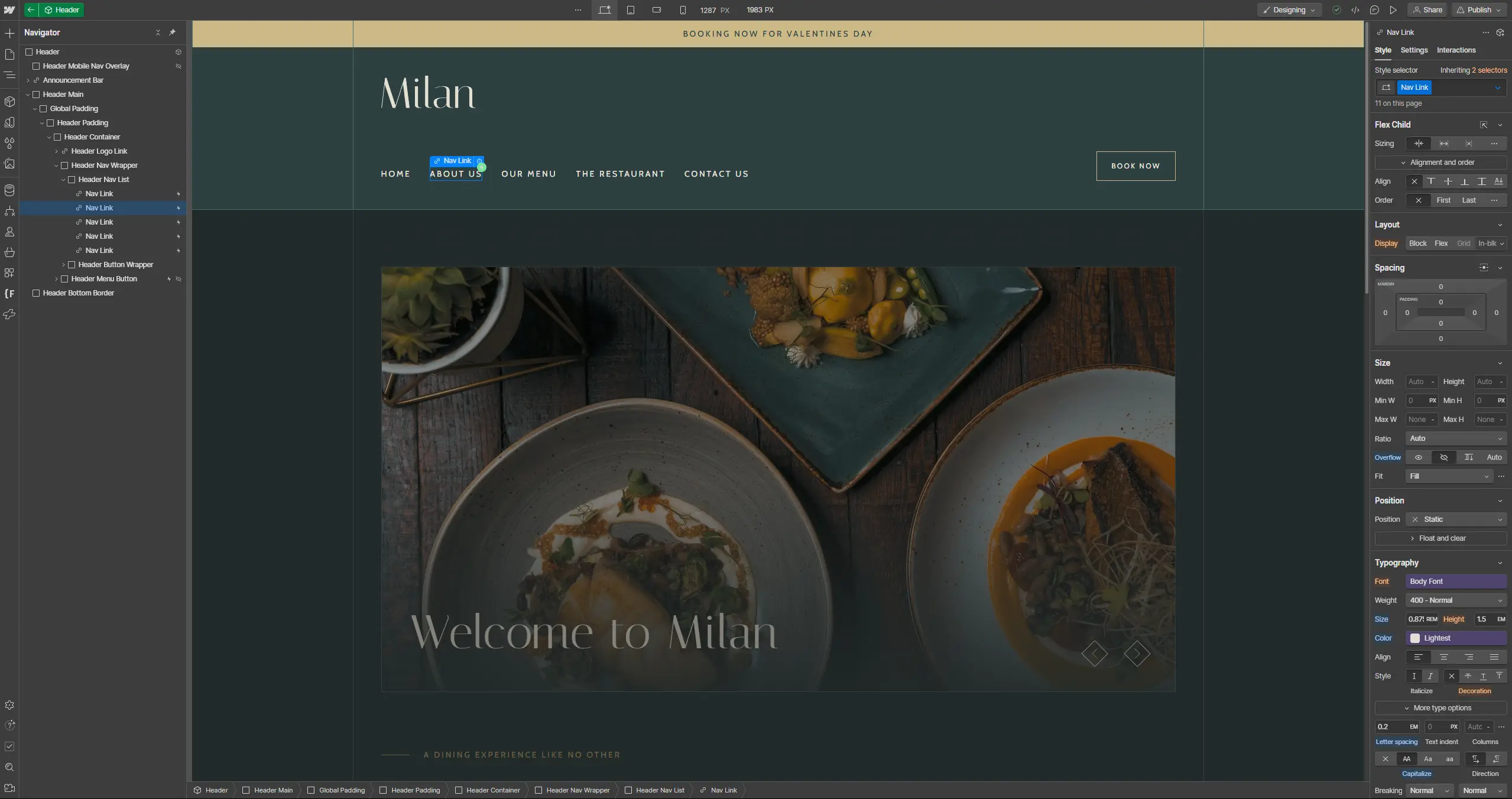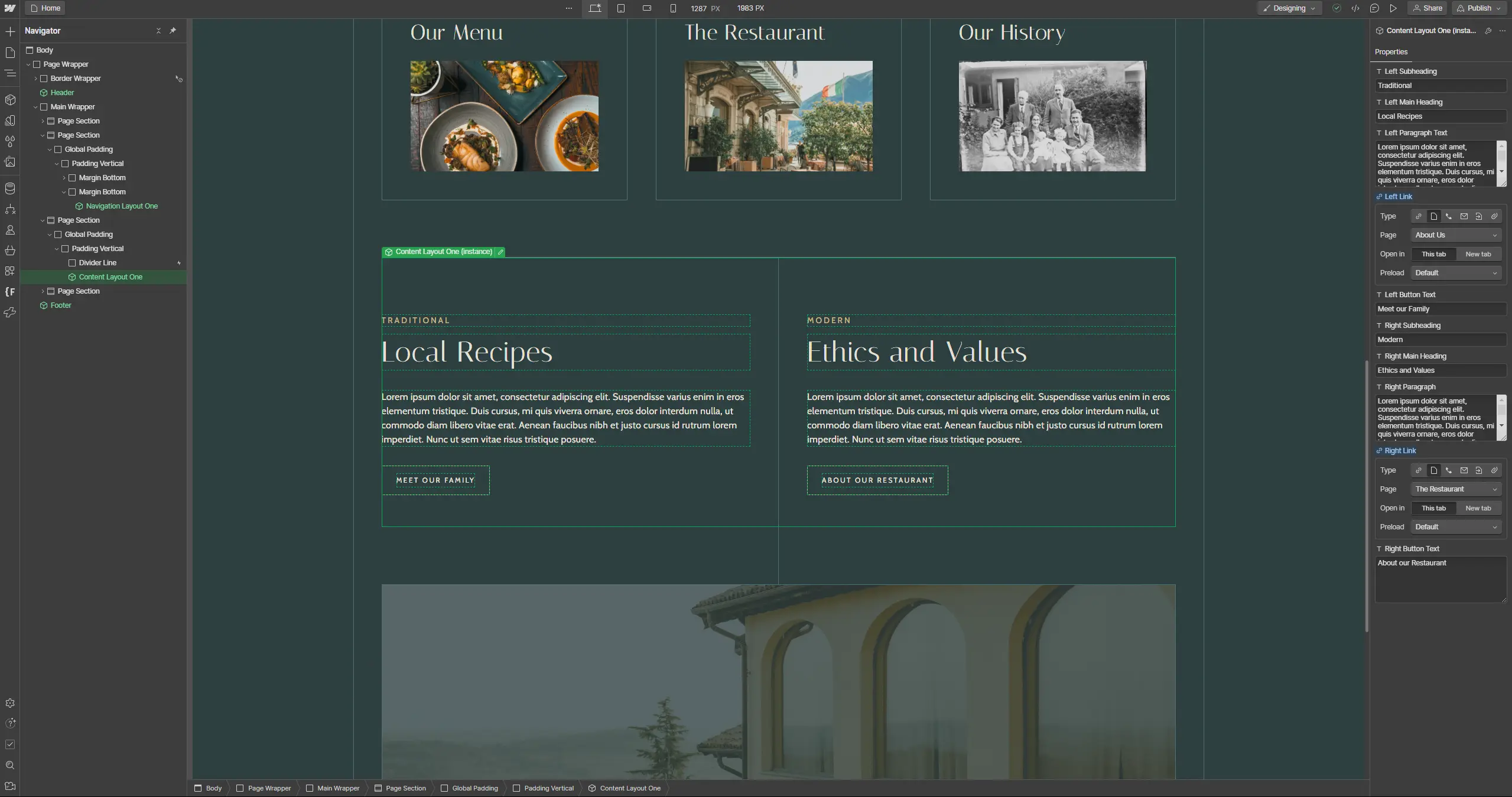Restauranti uses Webflow's component system to bundle up its layouts into consistent, easy to replicate packages. You can then use these components to create new sections for additional content super easily!