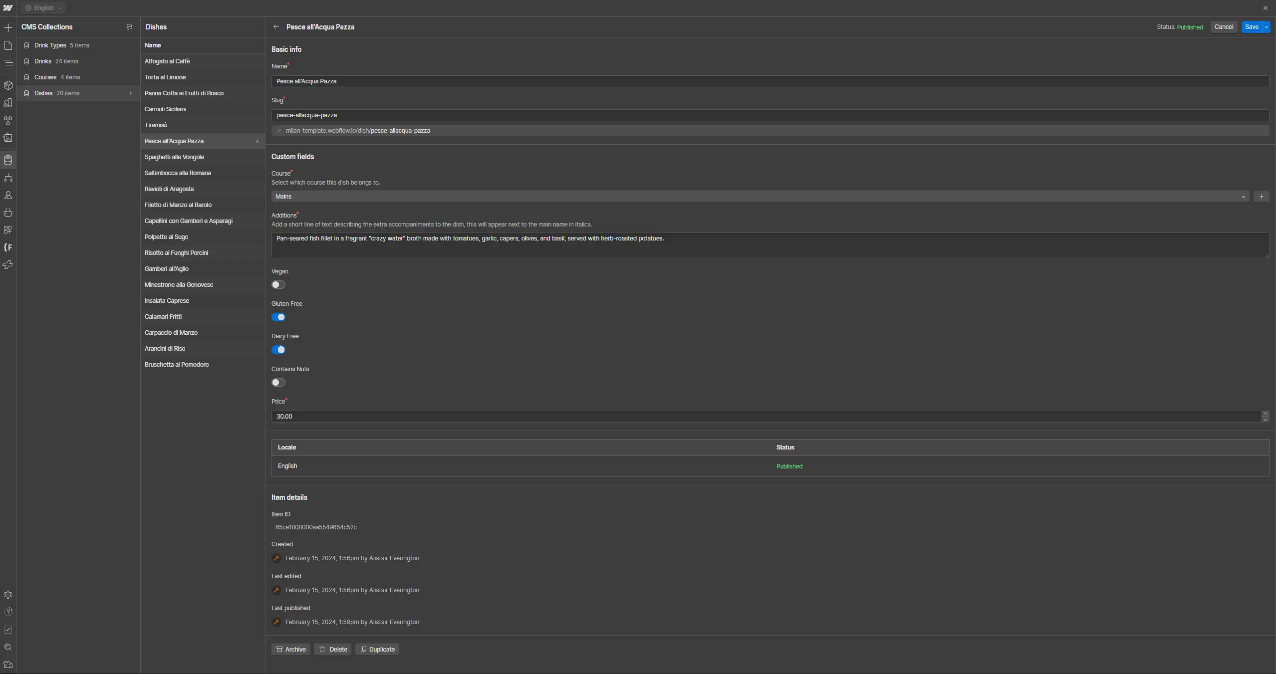 For CMS content, in this case the Menu Items and Categories, you'll need to make adjustments in the CMS editor. This can be found on the left hand sidebar (its the icon with the three discs stacked together). From here click the collection you want to edit, and then the specific item you want to adjust. You'll then see a list of all the properties of that item, which you can change to your hearts content. After you're done, click save, and the edits will go live the next time you publish the site.