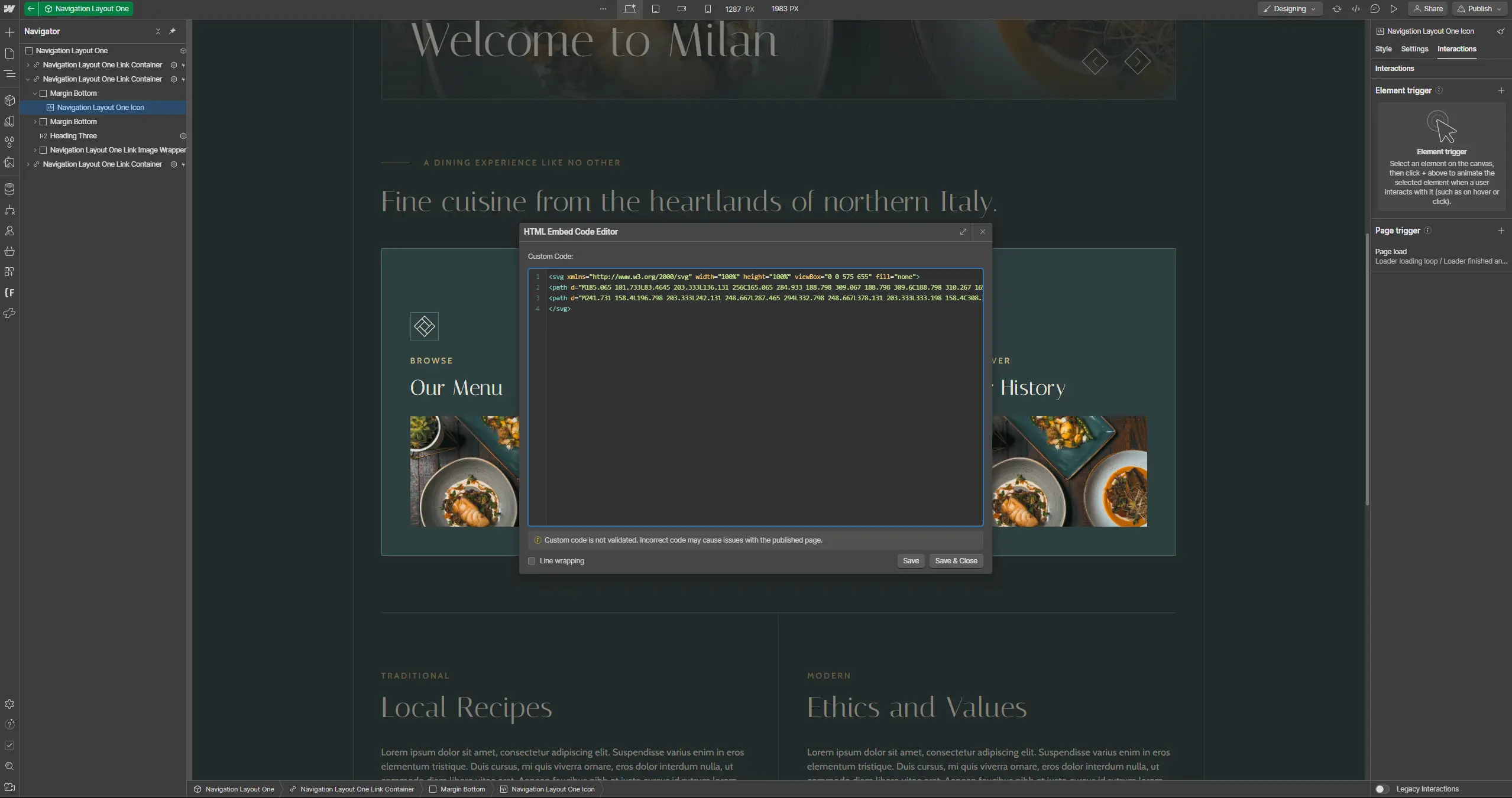 Restauranti uses SVG's in a few places to add crisp iconography and assets to the template. You can identify these through the 'Code Embed' blocks on the site.